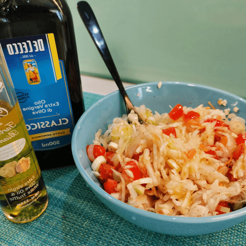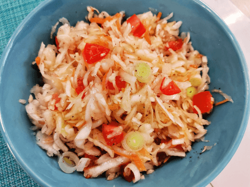 Cabbage salad with tomatoes and onions is a bright and refreshing dish rooted in Russian culinary traditions. Fermented cabbage, prepared with love and patience, gives the salad a tangy richness, while juicy cherry tomatoes add natural sweetness and freshness. Leeks provide a light spiciness, and the combination of olive and truffle oils reveals delicate aromatic notes, making the dish refined. Spices like sumac and ground black pepper add a mild heat and depth of flavor. This salad is perfect as an appetizer or side dish to main courses, refreshing the palate and stimulating appetite. Its simplicity in preparation and harmony of flavors make it an excellent choice for cozy family dinners and festive gatherings.