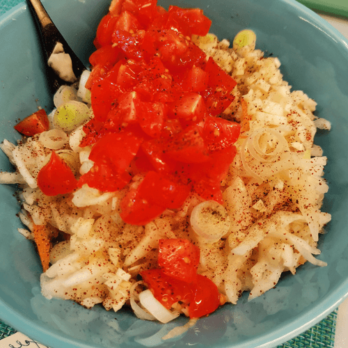 Place the sauerkraut in a bowl, add finely chopped cherry tomatoes and onion.