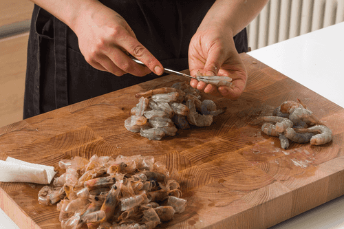 Peel the shrimp from the shell (tails can be left on, but the intestine must be removed).