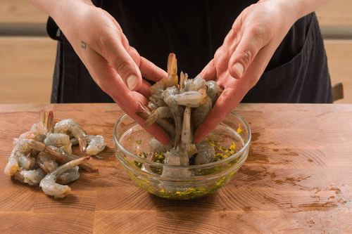 Place the shrimp in a bowl with oil and spices and let marinate for 10-15 minutes.