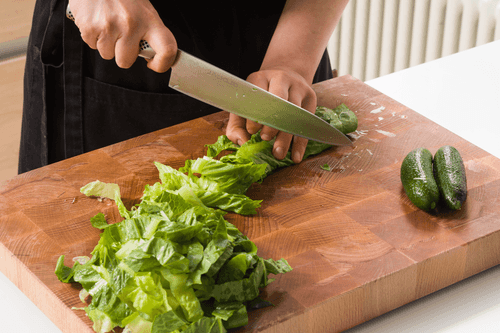 Meanwhile, slice the cucumbers and cut the salad into wide strips, then place them in a salad bowl.