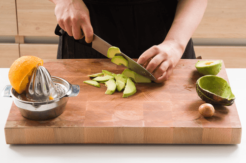 Remove the pit and skin from the avocado, slice it like cucumbers, drizzle with orange juice, and add to the salad bowl.