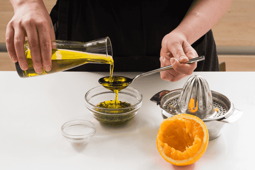 Prepare the sauce by mixing olive oil with orange juice, chopped chili pepper, and salt.