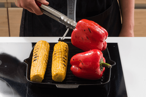 Brush the sweet pepper with oil and grill it whole for 1-2 minutes on each side. It should not become mushy but soften slightly and acquire a smoky aroma.