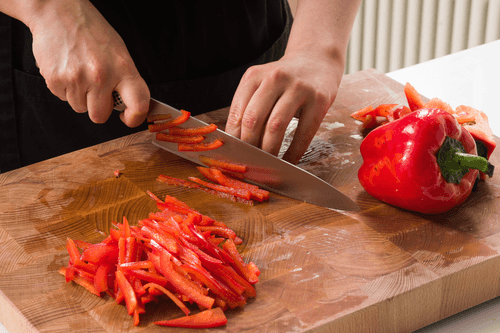 Cut the sweet pepper into strips and add it to the salad.