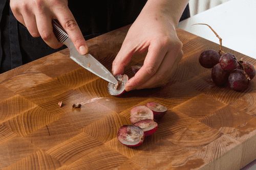 Remove the seeds from the grapes and cut them in half or quarters.