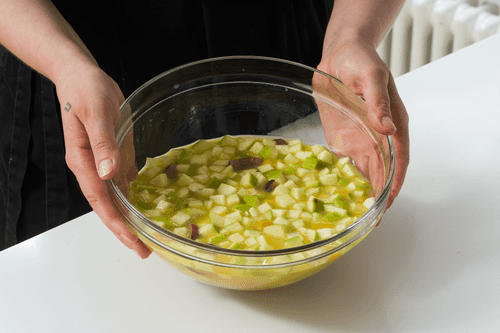 Cut the fruits into cubes or slices.