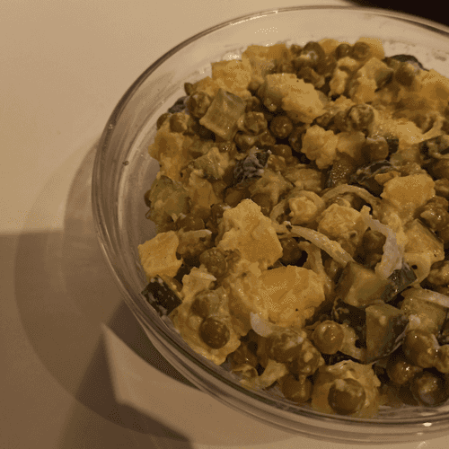 Potato salad is a classic dish of Russian cuisine, simple and nutritious, loved by many generations. Its roots go back to the distant past when potatoes became a staple on the tables of Russian residents. The salad has a soft, creamy taste thanks to the potatoes and mayonnaise, while fresh cucumbers and onions add a pleasant crunch and slight sharpness. Green peas bring a delicate sweetness that balances the flavor. This salad is perfect as a side dish for meat dishes or as an independent cold appetizer. It is ideal for cozy family dinners and festive gatherings when you want something simple yet truly homemade.