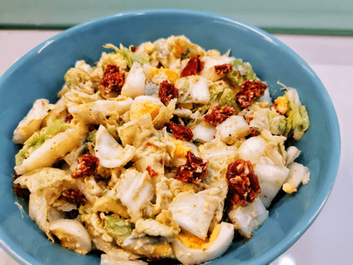 Peel the eggs, cut each into two or three pieces, and add to the salad.