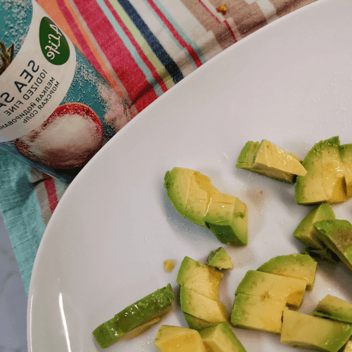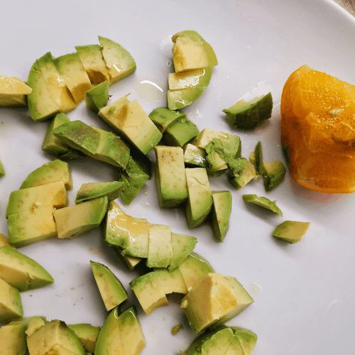 Cut the avocado into small cubes and drizzle with lemon juice.