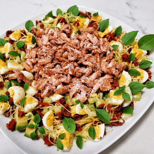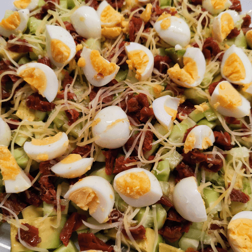 Salad with shimeji mushrooms and basil is a true symphony of flavors. Shimeji, with their delicate texture and subtle nutty undertone, harmoniously combine with refreshing avocado and crunchy cucumbers. Quail eggs add richness to the dish, while sun-dried tomatoes provide a slight tanginess. Parmesan adds a hint of spiciness, and cream cheese brings softness and a creamy texture. The basil leaves topping the salad refresh it and give aromatic depth. This dish is perfect for a light dinner or stylish presentation on a festive table. It reveals its full potential when warm, allowing each ingredient to showcase its true richness.