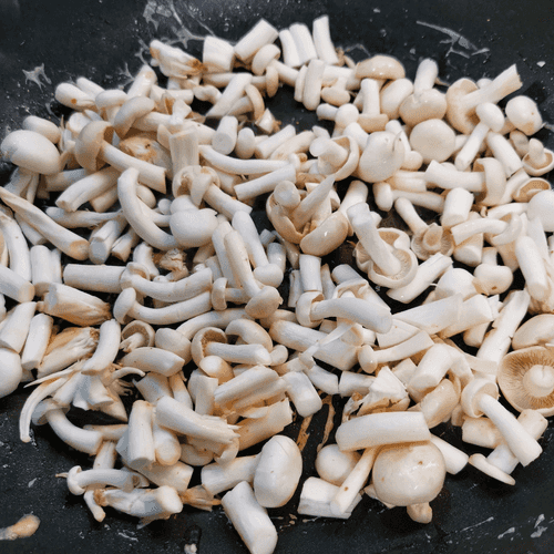 Place the shimeji in the heated olive oil in the pan.