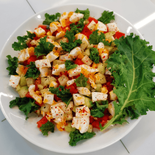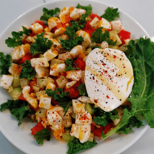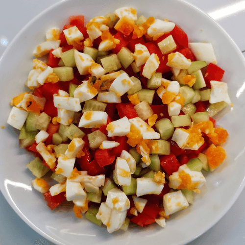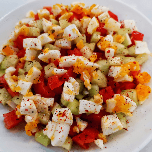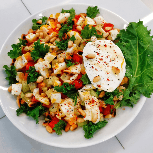 Vegetable salad with egg and sour cream is a light yet hearty dish filled with freshness and tenderness. The salad combines crunchy cucumbers, juicy tomatoes, and nutritious eggs to create a harmonious balance of flavors. Creamy sour cream adds softness, while toasted pine nuts provide a refined nutty note. Kale leaves bring a touch of green freshness, and spices add zest. Olive oil completes the composition, making the salad rich and aromatic. This recipe is perfect for a light dinner or nutritious snack, and its simplicity and naturalness make it an excellent choice for those who value healthy and tasty food. The author's approach allows enjoying familiar ingredients in a new rendition.