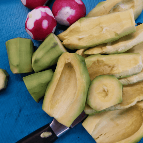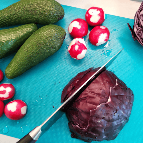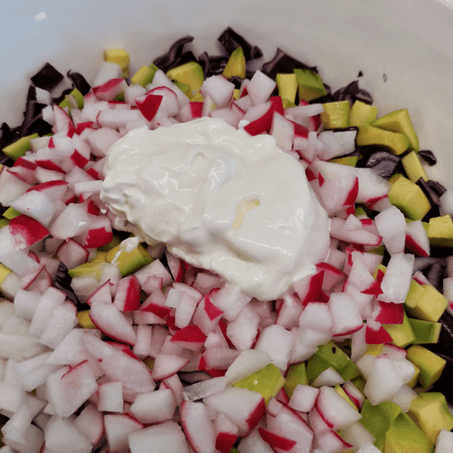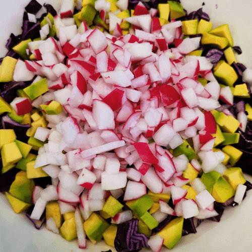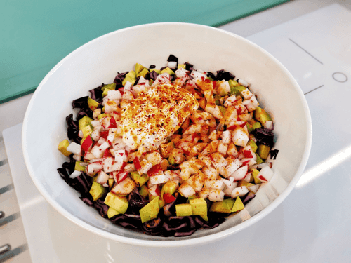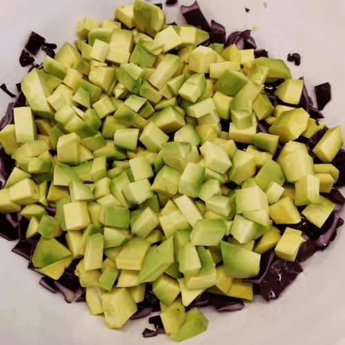 Cut the avocado into small cubes and combine it in a bowl with the cabbage.