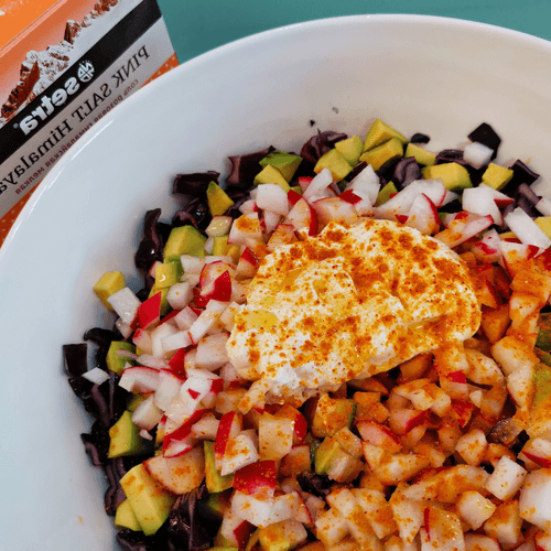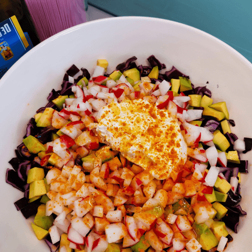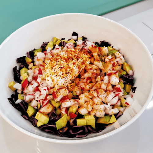 This avocado and red cabbage salad with sour cream is a true gastronomic masterpiece of author cuisine, combining the tenderness of avocado, the crunchy texture of cabbage, and the spiciness of radish. Its harmonious taste is complemented by the softness of sour cream, while saffron adds refined Eastern notes. Such a salad is an ideal choice for those who appreciate the freshness and benefits of natural ingredients. Olive and mustard oils create a rich aroma, while ground chili pepper adds a spicy kick. The dish is perfect as a light appetizer or an exquisite side dish to main courses. This salad not only delights the palate but also nourishes the body with vitamins, making it an excellent choice for healthy eating.