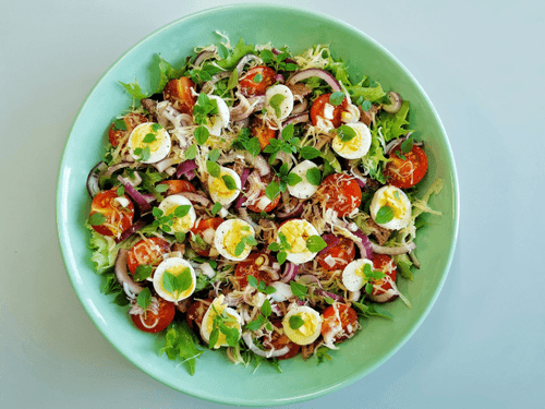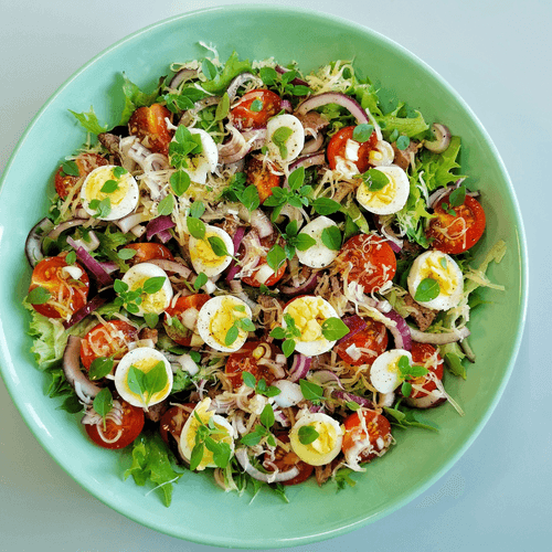 This vegetable salad with cod liver and quail eggs is a true culinary masterpiece. It combines the tenderness of canned cod liver, the piquancy of quail eggs, and the freshness of crunchy vegetables. Frilly leaves add airiness to the dish, while cherry tomatoes provide a sweet, juicy accent. Red onion adds a slight sharpness, and grated Parmesan brings pleasant richness to the flavor. The composition is completed by aromatic basil and exquisite olive oil that highlight the natural taste nuances of the ingredients. This salad is not only light but also nutritious, making it perfect for dinner or a festive table. Its elegance and richness make it an excellent choice for those who appreciate gastronomic pleasure.