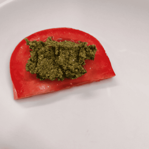 Place a slice of tomato on the plate and spread a teaspoon of pesto sauce on it.