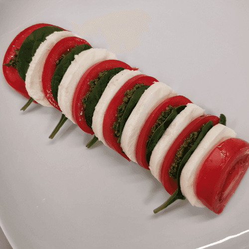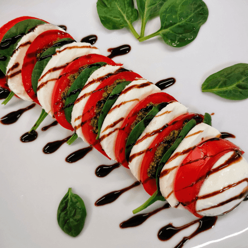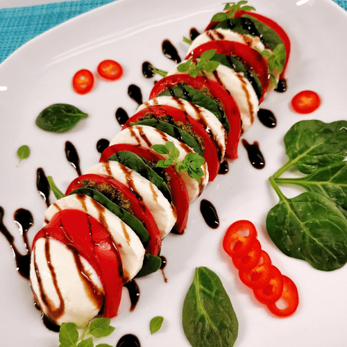 Caprese with spinach is a fresh and elegant version of the classic Italian salad. It features a simple yet brilliant combination of juicy tomatoes, tender mozzarella, and aromatic pesto, complemented by fresh spinach leaves and sweet peppers. The dish hails from Italian cuisine, where simplicity and natural ingredients harmonize in flavors. The light acidity of balsamic sauce enhances the creamy texture of the cheese and the freshness of the greens. Caprese is perfect as an appetizer or light salad, and its vibrant appearance makes it a centerpiece on any table. This dish embodies summer freshness, is suitable for healthy eating, and offers true pleasure with every bite.