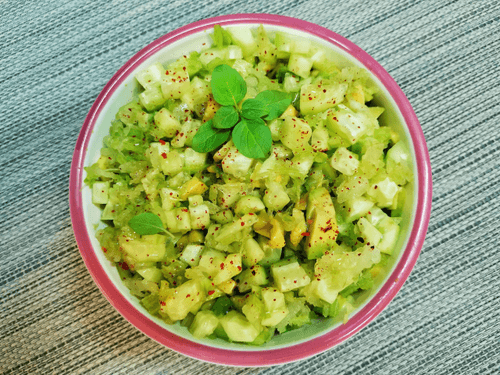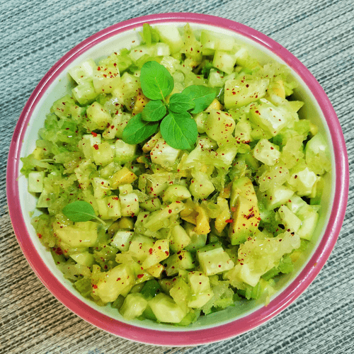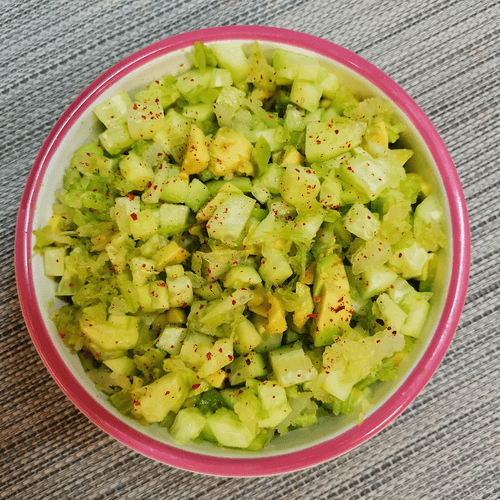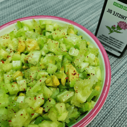 Зелёный салат с маслом расторопши — это свежий и питательный авторский рецепт, который сочетает в себе хрустящие овощи и мягкую кремовую текстуру авокадо. Богатый витаминами и полезными жирами, этот салат является настоящей находкой для тех, кто ценит здоровое питание. Масло расторопши, известное своими целебными свойствами, придаёт блюду легкую ореховую нотку и благотворно влияет на организм. Лёгкость сельдерея и огурцов гармонично дополняется пикантностью чеснока и перца чили, а лимонный сок придаёт освежающую кислинку. Этот салат идеально подходит как самостоятельное блюдо или как сопровождение к лёгким закускам. Его можно подать на ужин в качестве освежающего дополнения к основному меню или включить в рацион для поддержания тонуса и энергии.