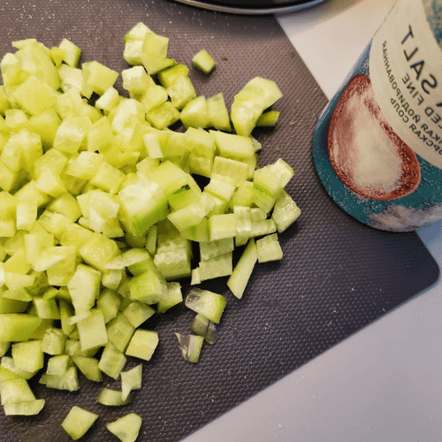 Peel the cucumbers and chop them finely. Add salt.