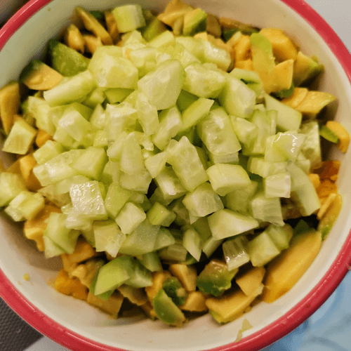 Add cucumbers to the avocado.