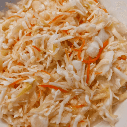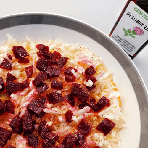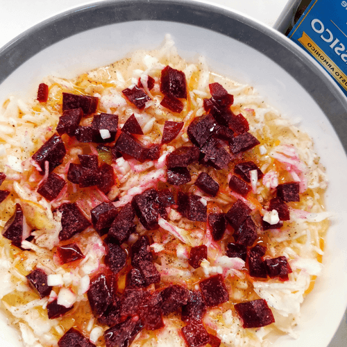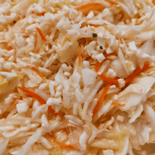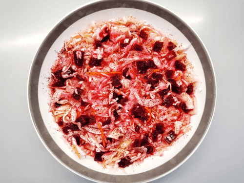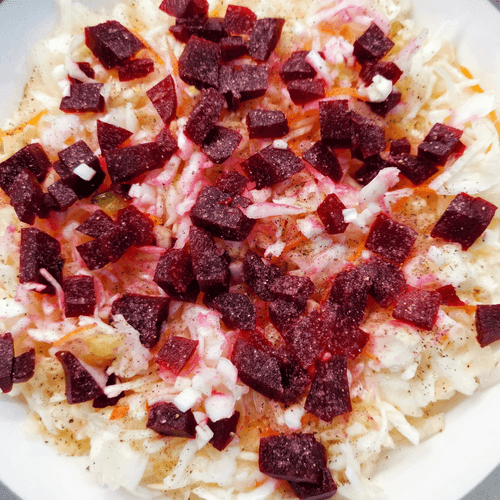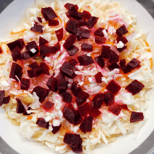 Этот салат из квашеной капусты со свеклой и чесноком – настоящий симбиоз ярких вкусов и пользы. Корни его происхождения уходят в традиции ферментированных продуктов, широко распространенных в славянской кухне. Квашеная капуста придаёт блюду приятную кислинку, а сладковатая свекла дополняет её мягкостью и насыщенным цветом. Чеснок вносит пикантную нотку, усиливая аромат. Заправка из масла расторопши и оливкового масла подчеркивает естественные вкусовые нюансы, а сумах добавляет легкую цитрусовую терпкость. Этот салат не только прекрасен на вкус, но и невероятно полезен: он насыщен витаминами, укрепляет иммунитет и поддерживает пищеварение. Идеален как самостоятельное блюдо или гарнир к мясу. Легкий, свежий, но в то же время глубокий и насыщенный – он удивит даже самых искушенных гурманов.
