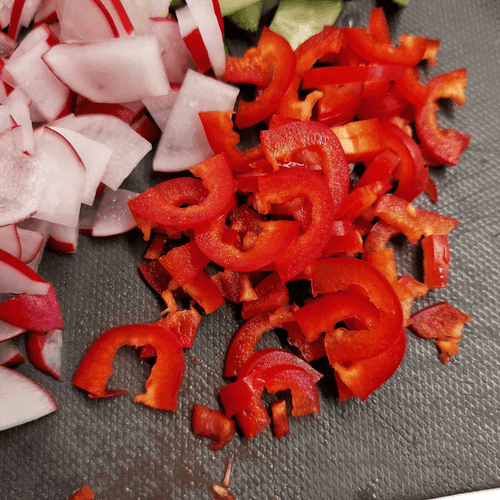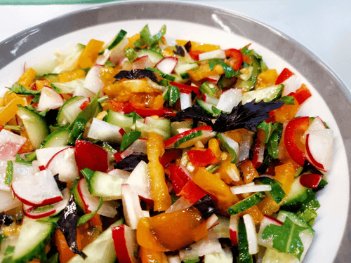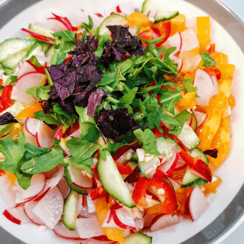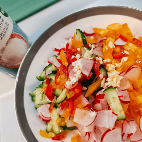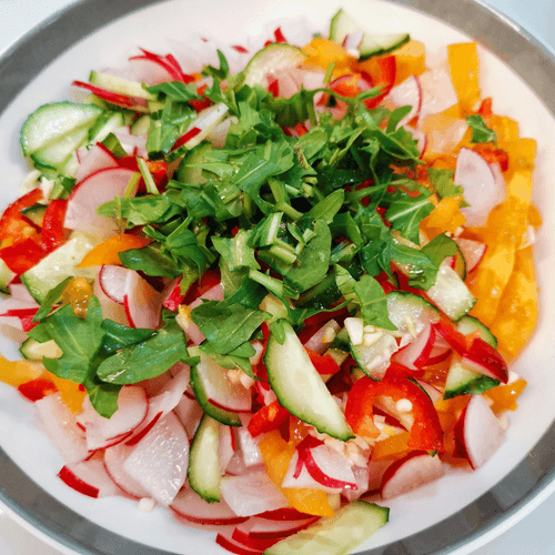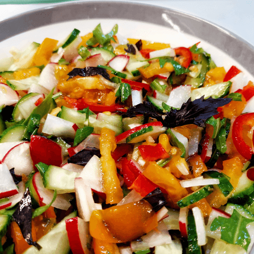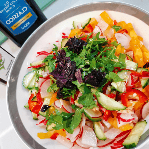 Summer vitamin salad is an ode to the freshness and vibrant colors of the summer season. This light yet nutritious salad combines crunchy cucumbers, juicy yellow tomatoes, zesty radishes, and sweet ramiro peppers, creating a harmony of textures and flavors. Aromatic garlic complements the composition, while arugula and red basil add an exquisite herbal note to the dish. Dressed with a blend of thistle oil and extra virgin olive oil, the salad gains softness and sophistication. Sea salt enhances the natural flavor accents of each ingredient. This salad not only fills the body with vitamins but also provides a sense of freshness and lightness. An ideal choice for a summer picnic, light dinner, or as an accompaniment to a main dish. Each forkful is a sip of a sunny day!