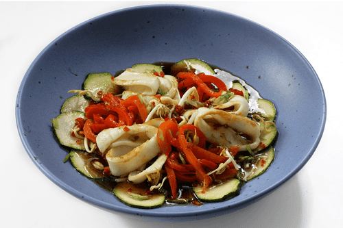 Dress the salad with the prepared sauce and mix. Place the squid on top of the salad and discard the garlic.