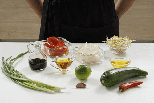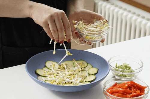 Place zucchini, green onion, sprouts, and pickled pepper in a serving bowl.