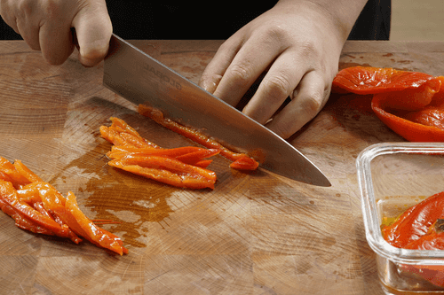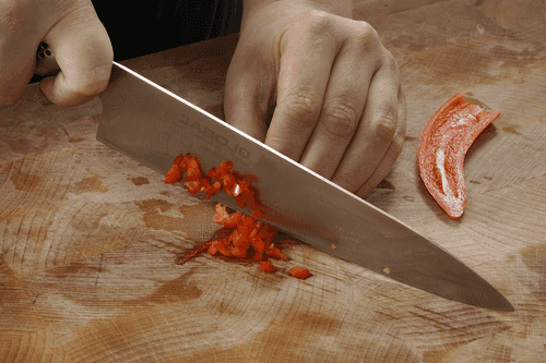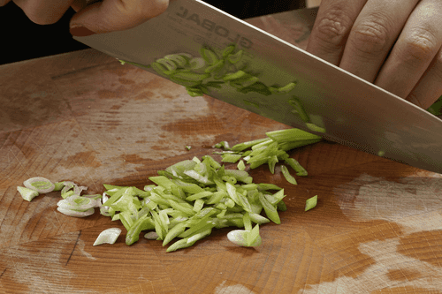 Cut the chili pepper in half, scoop out the seeds, and chop finely.