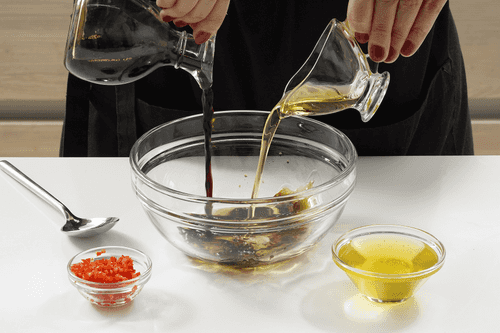 Combine honey, soy sauce, sesame oil, and chili pepper in a bowl.