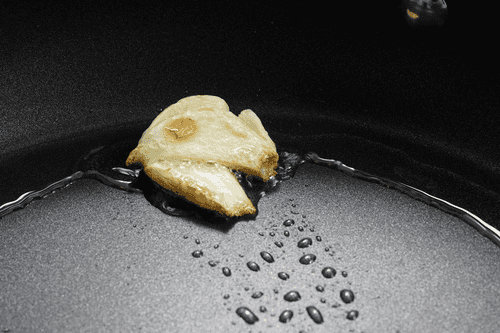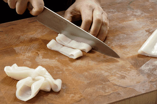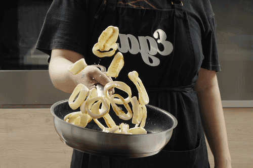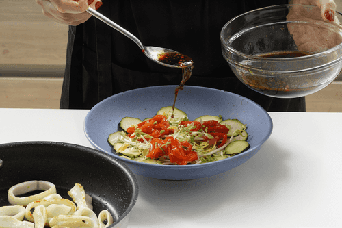 Place squid rings in the pan, fry on high heat for about 3 minutes, stirring until they turn white.