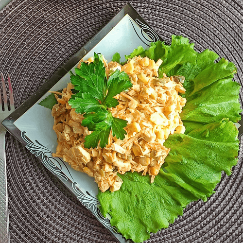 The 'Venice' salad is a harmony of flavors and textures inspired by Russian cuisine. Legend has it that it originated as an experiment combining tender chicken fillet, spicy pickled cucumbers, and pungent garlic. Crispy Korean carrots and juicy corn add freshness and a hint of sweetness, while grated cheese provides creaminess. Dressed with mayonnaise, it becomes truly rich and hearty. This salad is perfect for festive gatherings as well as everyday dinners, impressing guests with its rich flavor palette. It pairs wonderfully with meat dishes and bread, creating an exquisite yet simple treat. Venice is renowned for its beauty and elegance, and this salad inspired by its atmosphere invites enjoyment in every bite.