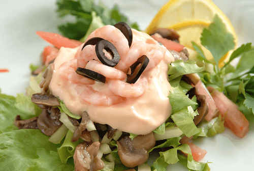 Mix shrimp and fried mushrooms with onion, add finely chopped dill and parsley, season with salt, and dress with mayonnaise. Mix everything.