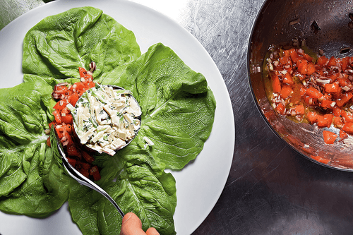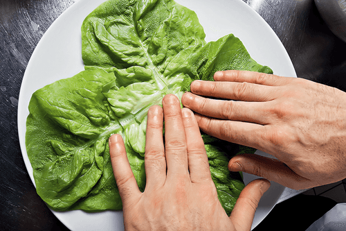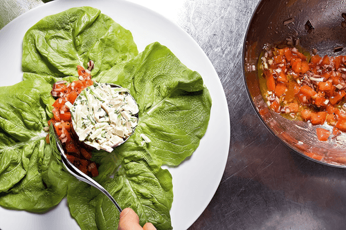 On a large plate, arrange four lettuce leaves in a cross, breaking off the part at the base of the leaf that resembles a gathered accordion with your hands, so that the leaves fully adhere to the plate.