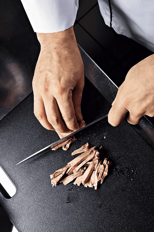 Cut the pre-cooked veal tongue into strips. You can easily check how well it is cooked by the skin - it should come off the meat easily.