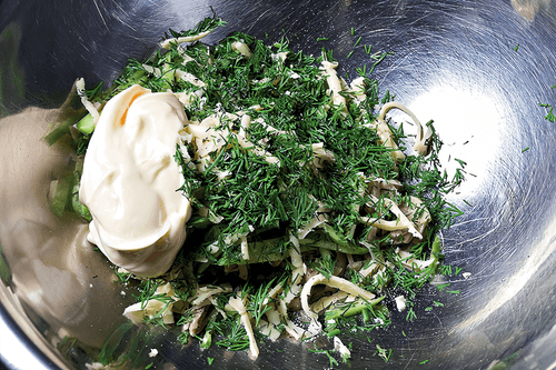 Cut the Baku cucumbers into very thin, almost transparent strips. Chop the dill, cilantro, and parsley not too finely to preserve the distinct dill flavor. In a bowl, mix the tongue, mushrooms, cucumbers, dill, and cheese. Add salt, season with ground fragrant pepper, and dress with mayonnaise. The mayonnaise can be homemade or store-bought, whichever type you prefer.