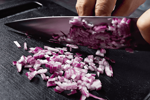 Finely chop the red onion. First, cut it into half rings, then chop the half rings into cubes. The red onion is moderately sweet and not too bitter — just what we need for our salad.