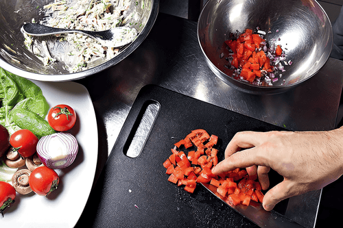Cut Baku tomatoes into cubes. It is important to cut them with a very sharp knife to avoid damaging the flesh and losing juice. Mix with onion, add salt, pepper, olive oil, and gently stir to avoid harming the tomatoes.