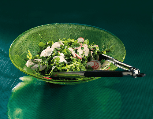 Thinly slice the daikon and radish. In a deep bowl, mix the daikon, radish, and salad leaves with coarsely chopped parsley and dill.
