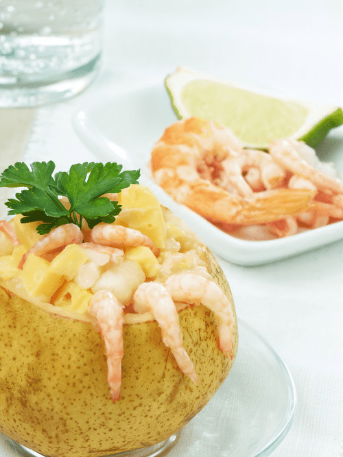Salad with brie cheese and shrimp is a refined combination of delicate seafood, creamy French cheese, and crunchy Chinese cabbage. Its origin is linked to European gastronomic traditions that value the balance of flavors and the sophistication of ingredients. Shrimp adds juiciness to the dish, brie cheese provides softness and a noble aroma, while pineapples introduce a subtle sweet note. Dressed with light mayonnaise and garnished with herbs, this salad becomes an ideal choice for a festive dinner or romantic evening. It delights not only with its taste but also with its elegant presentation, turning an ordinary meal into a true culinary delight.