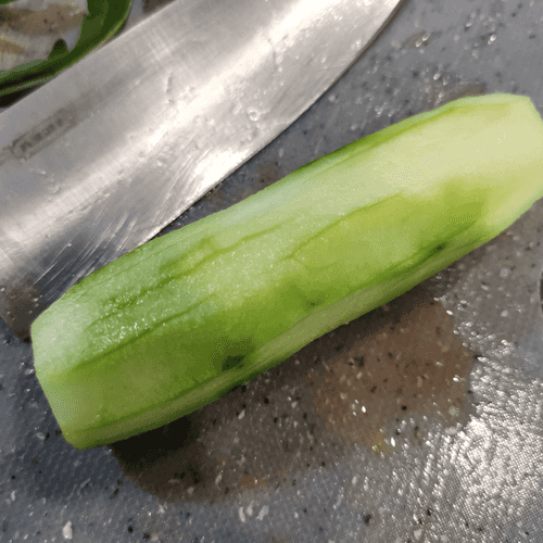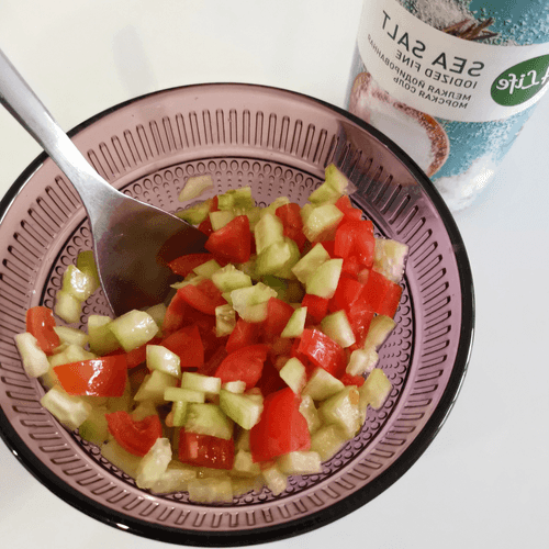 Cut it into small cubes and add to the tomatoes. Salt and mix.