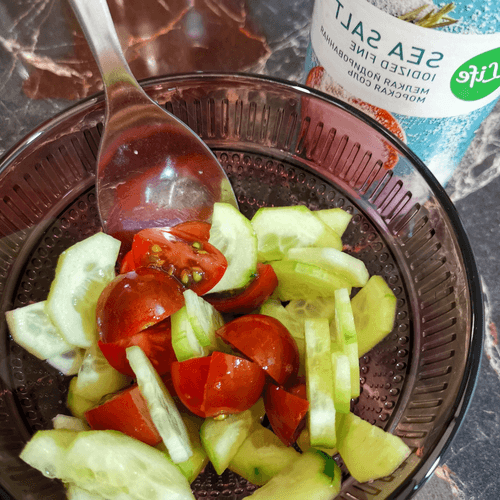 Cut the tomatoes into quarters and add them to the cucumbers. Salt and mix.