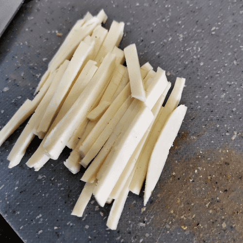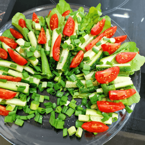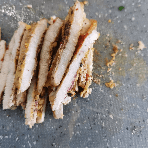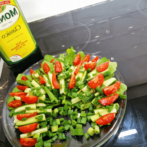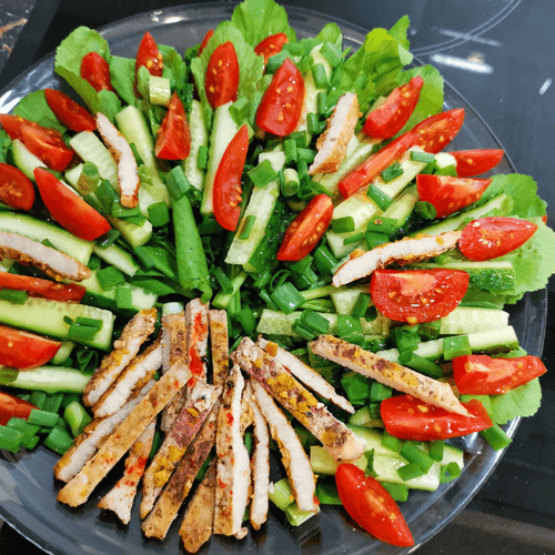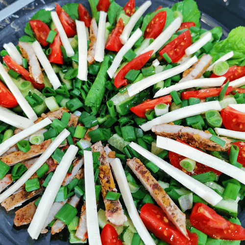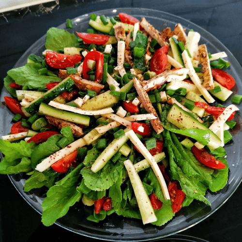 Turkey and suluguni salad is an exquisite dish of European cuisine that combines the freshness of vegetables with the rich flavors of turkey and suluguni. This salad reflects the traditions of Mediterranean diet where the balance of flavors and textures plays an important role. Light greens like cichorium, crunchy cucumbers, and sweet tomatoes perfectly complement the softness of lightly salted suluguni, while tender fried turkey adds richness to the dish. Sea salt enhances the natural shades of ingredients, and olive oil gives a light velvety texture. The finishing touch is sumac which adds a tangy zest. This salad is perfect for a light dinner or as an elegant appetizer on a festive table, impressing with its sophistication and richness of flavor nuances.