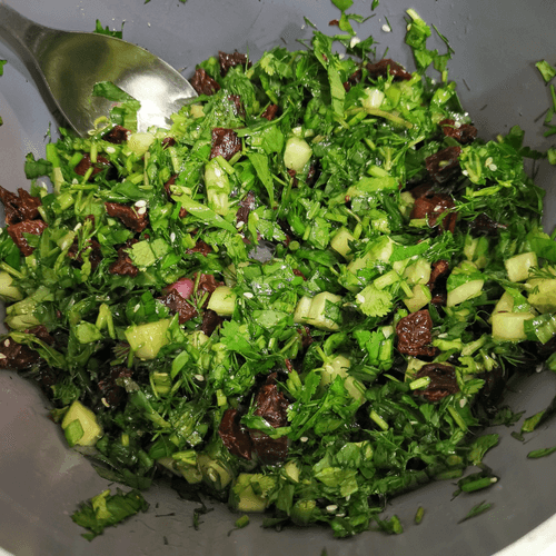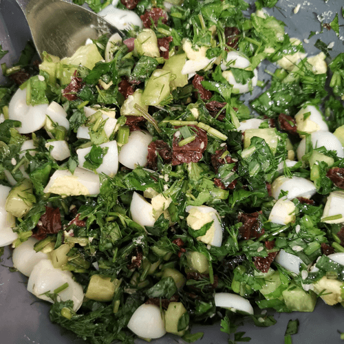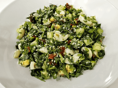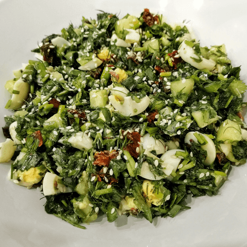 Салат с вялеными помидорами — это истинное воплощение средиземноморского вкуса, наполненного свежестью зелени и нежностью перепелиных яиц. Вяленые томаты, пропитанные оливковым маслом, придают блюду насыщенный, сладковато-пряный оттенок, который прекрасно дополняется хрустящим огурцом и ароматными травами: кресс-салатом, рукколой, петрушкой и кинзой. Кунжут придаёт нежный ореховый акцент, а морская соль подчёркивает естественный вкус ингредиентов. Этот салат идеален для лёгкого летнего ужина или изысканной закуски, которая напомнит о солнечном побережье Италии или Греции.