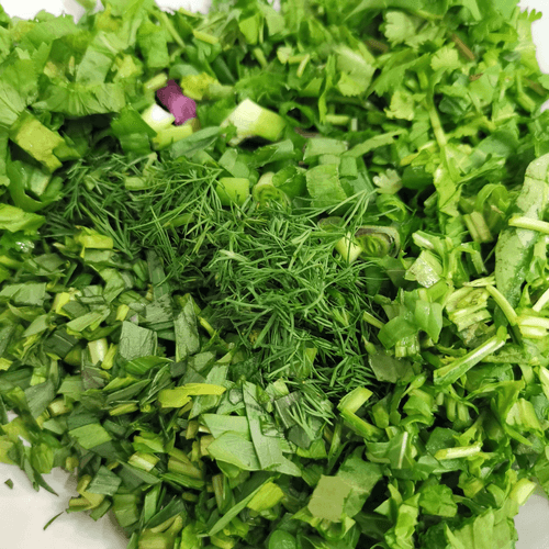 In a deep bowl, combine the greens with oil, season with salt, and mix.
