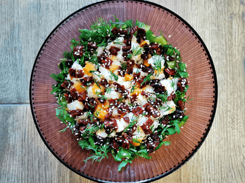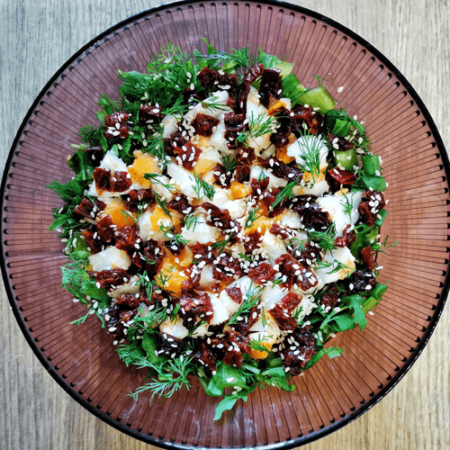 Салат из яиц с вялеными томатами — это изысканное сочетание насыщенных вкусов и свежести. Корни этого рецепта уходят в европейскую кухню, где простота ингредиентов сочетается с утонченностью вкусовых оттенков. Нежные кусочки вареных яиц, пропитанные ароматом оливкового масла и горчичного соуса, дополняются пикантностью вяленых томатов. Рукола и укроп придают блюду легкость и свежесть, а кунжут добавляет тонкий ореховый привкус. Этот салат прекрасно подходит как самостоятельное блюдо или гарнир, он радует своей яркостью и гармонией вкусов. Идеален для легкого ужина или изысканной закуски на праздничном столе.