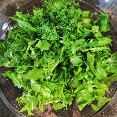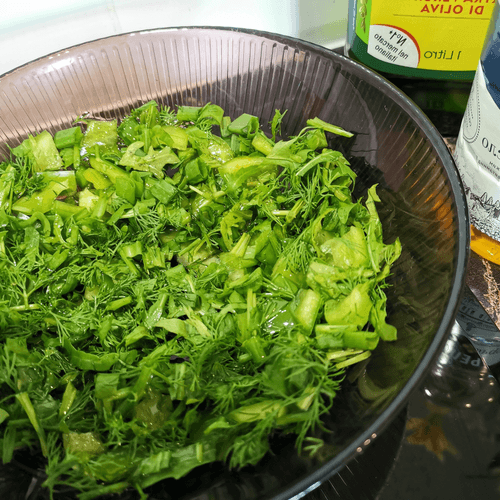 Chop the greens finely and place them in a deep bowl.