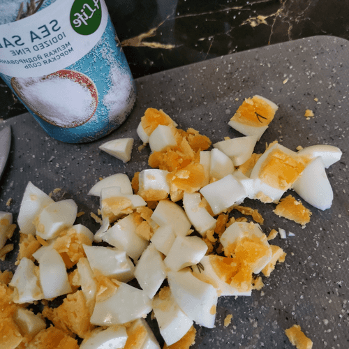 Chop the eggs coarsely and salt them.