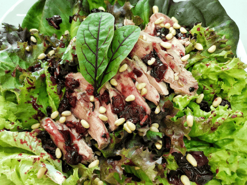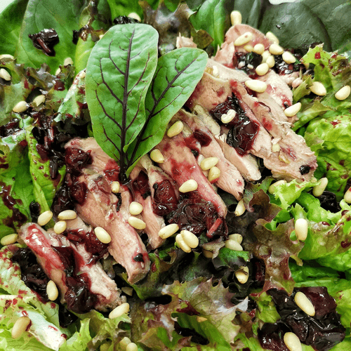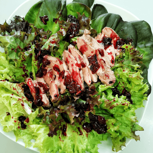 Салат из утки с заправкой из черешни — это настоящий гастрономический шедевр, который сочетает в себе богатство вкусов и изысканную подачу. Варено-копченая утка придаёт блюду насыщенный, слегка дымный аромат, а заправка из черешни с вином и базиликом добавляет фруктовую кислинку с благородными травяными нотками. Это блюдо воплощает баланс между сладостью, кислотностью и глубиной вкуса. Особая текстура салата романо и лолла-росса обеспечивает свежесть и хрусткость, а кедровые орехи привносят лёгкую маслянистость. Идеально подойдёт как закуска для изысканного ужина или праздничного стола. Салат отражает современный авторский стиль, играя на контрасте вкусов и ароматов, а щавель и базилик добавляют тонкую, освежающую зелёную нотку.